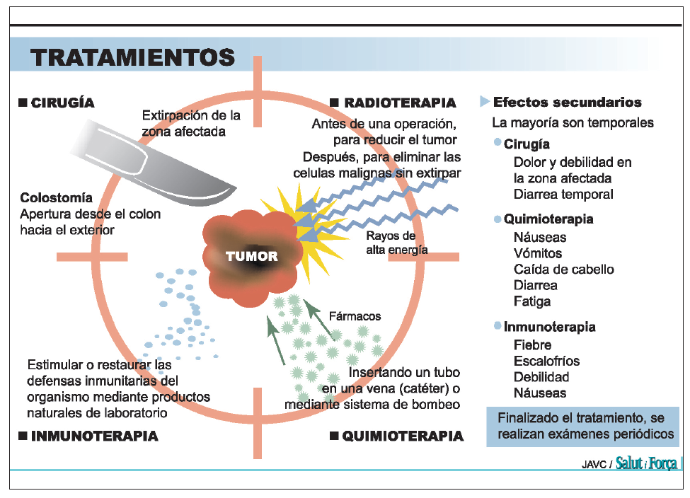 Los programas de cribado consisten en solicitar estos análisis de heces a todas las personas mayores de 50 años sin sospecha. Detectada la sangre -si la hay- se procede a una colonoscopia. Si ésta detecta un tumor una biopsia determinará si es maligno y las terapias: cirugía, radio y/o quimioterapia.