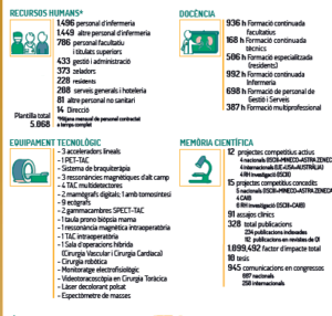 La memoria científica de 2017 arroja —en este caso por año— 12 proyectos científicos competitivos activos nacionales e internacionales de alta acreditación; 15 proyectos competitivos concedidos, 91 ensayos clínicos, 328 publicaciones científicas (casi una al día) y 945 comunicaciones en congresos científicos, 258 internacionales.