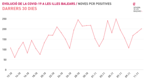 Según Arranz, en los últimos días la IA se ha situado en 260 casos por 100.000 habitantes, lo que parece determinar lo que ha calificado como el inicio de una “tímida y lentamente una bajada”, más importante en Mallorca, con 257 y menos en Ibiza (aunque baja), con una IA de 291. También ha bajado, ha dicho, la IA en siete días.