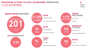Con los últimos contagios, la cifra histórica de afectados de COVID19 conocidos en Baleares se eleva hasta 21.290. de los cuales en estos momentos están siendo atendidos 3.680; hay 225 hospitalizados en planta (13 más que ayer) y 54 en UCI (uno más), con lo que la presión asistencial vuelve a subir. Se han dado 262 altas, 20 hospitalarias.