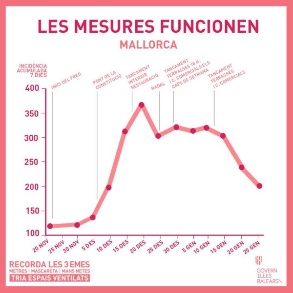 En cualquier caso, desde la Conselleria de Salut se deja ver cierto optimismo. El tuiter de la Conseller, @SalutGOIB, ha publicado el gráfico sobre estas líneas en el que se relaciona las medidas de contención con la caída y tendencia a la baja del número de contagios.