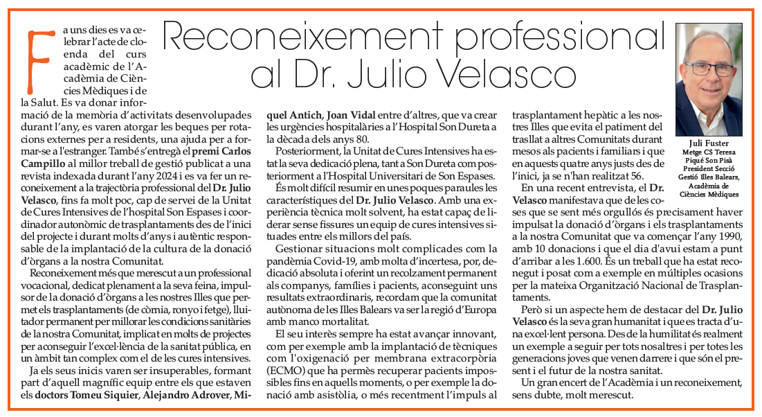 Reconeixement més que merescut a un professional vocacional, dedicat plenament a la seva feina, impulsor de la donació d’òrgans a les nostres Illes que permet els trasplantaments (de còrnia, ronyo i fetge), lluitador permanent per millorar les condicions sanitàries de la nostra Comunitat, implicat en molts de projectes per aconseguir l’excel·lència de la sanitat pública, en un àmbit tan complex com el de les cures intensives.