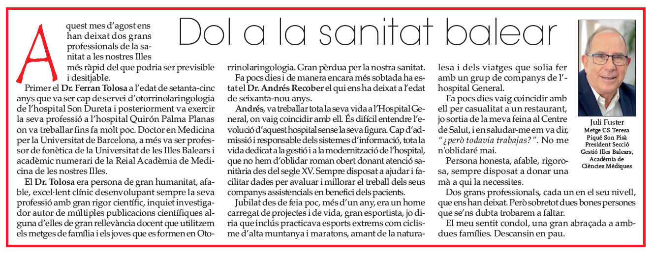 Aquest mes d’agost ens han deixat dos grans professionals de la sanitat a les nostres Illes més ràpid del que podria ser previsible i desitjable.