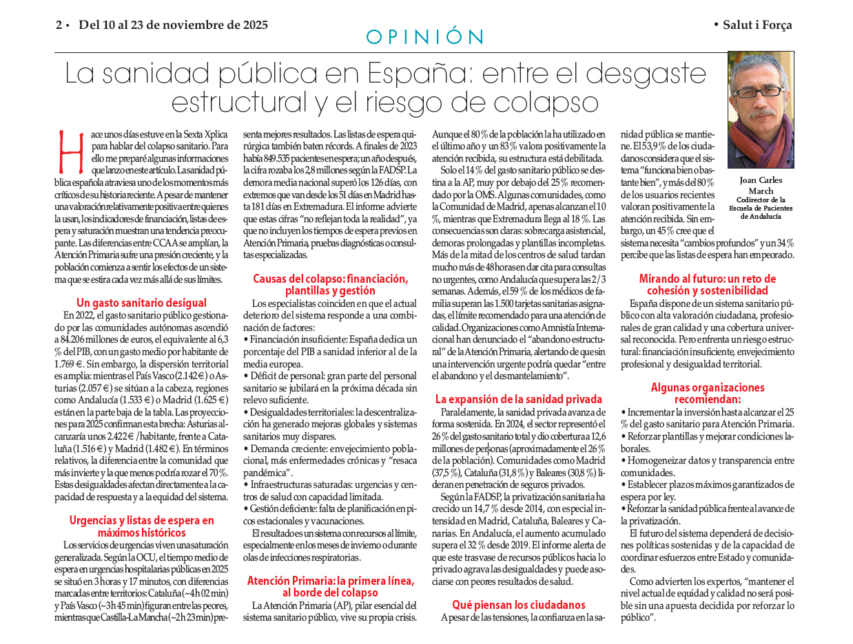 Hace unos días estuve en la Sexta Xplica para hablar del colapso sanitario. Para ello me preparé algunas informaciones que lanzo en este artículo. La sanidad pública española atraviesa uno de los momentos más críticos de su historia reciente. A pesar de mantener una valoración relativamente positiva entre quienes la usan, los indicadores de financiación, listas de espera y saturación muestran una tendencia preocupante. Las diferencias entre CCAA se amplían, la Atención Primaria sufre una presión creciente, y la población comienza a sentir los efectos de un sistema que se estira cada vez más allá de sus límites.