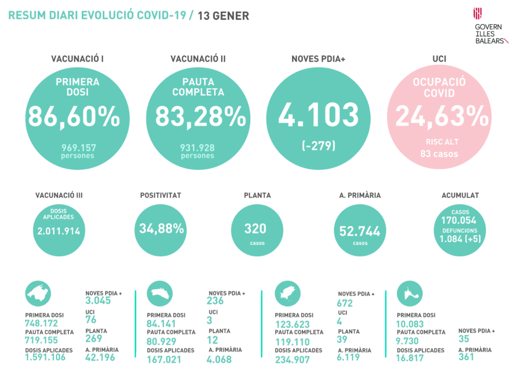La isla con mayor incidencia acumulada es Ibiza, con una IA14 de 3.558 por 100.000 (en ascenso), seguida de Menorca, con 3.180 (en descenso); Mallorca con 2.806 (en ascenso) y Formentera con 1.990 (en ascenso). Desde que empezó la pandemia, se han detectado 174.197 casos de COVID en las islas. La positividad de las pruebas diagnósticas realizadas en la última jornada es del 31,86 %, más de 6 veces el 5% que no hay que superar.