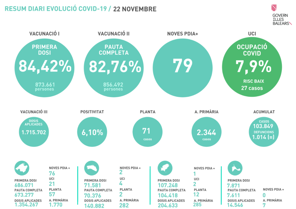 Pese a que la vacunación generalizada (ya es casi un 83% la población completamente vacunada) está reduciendo enormemente el impacto de la pandemia en morbi-mortalidad, lo cierto es que las muertes siguen produciéndose y en las últimas 24 horas se han registrado otras con cinco, con lo que el total alcanza ya las 1.019.