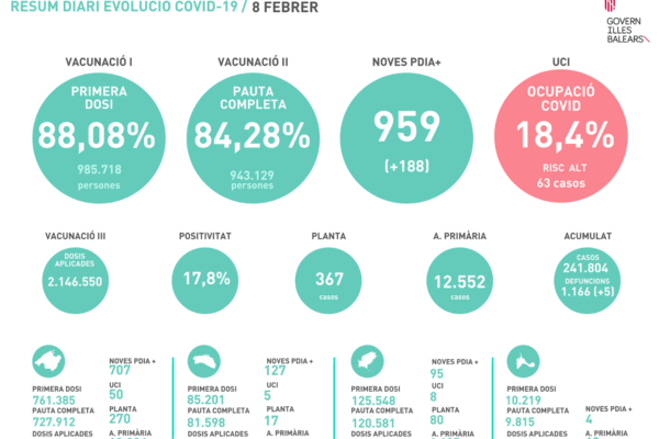 Repunte de casos de COVID19 en Baleares, con 959, 188 más que ayer, aunque sigue en marcha el plan de desescaladacalendar_today8 febrero, 2022editJuan Riera Roca